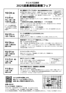 令和7年10月24日(金)~11月9日(日)まで「2025読書週間図書館フェア」を開催します。(詳細は下記掲載のチラシ画像をクリックしてご覧ください。)